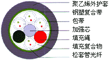產品型號: GYSTS也叫(GYTS) 光纖松套管 金屬中芯加強件 纜芯填充油膏 軋紋鋼帶粘結PE護套
